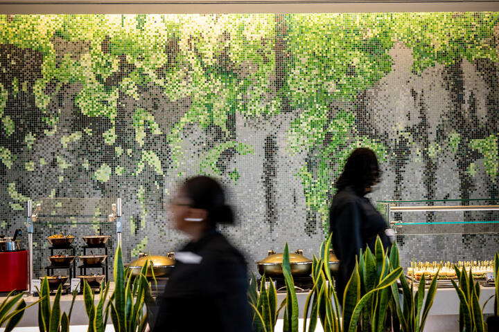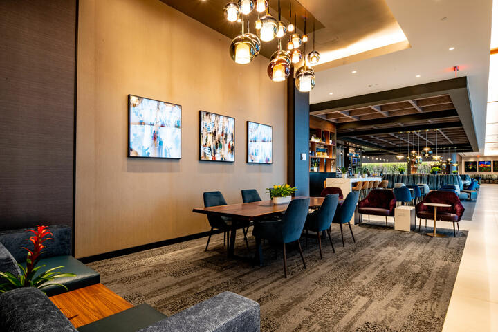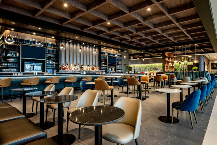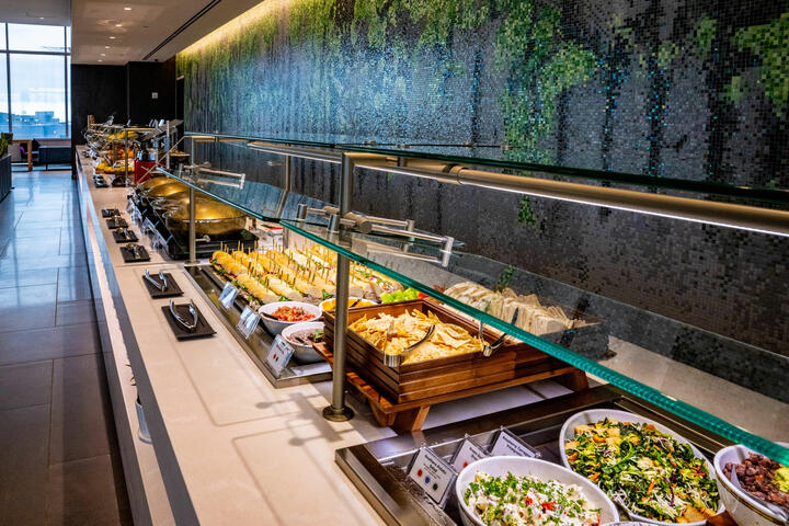 The 24,000-plus-square-foot Club boasts panoramic airfield views and amenities for every type of traveler and includes a theater-style media wall, 16-seat bar and sound-proof telephone booths for focused work. The space is also equipped with a large food buffet and two beverage stations.