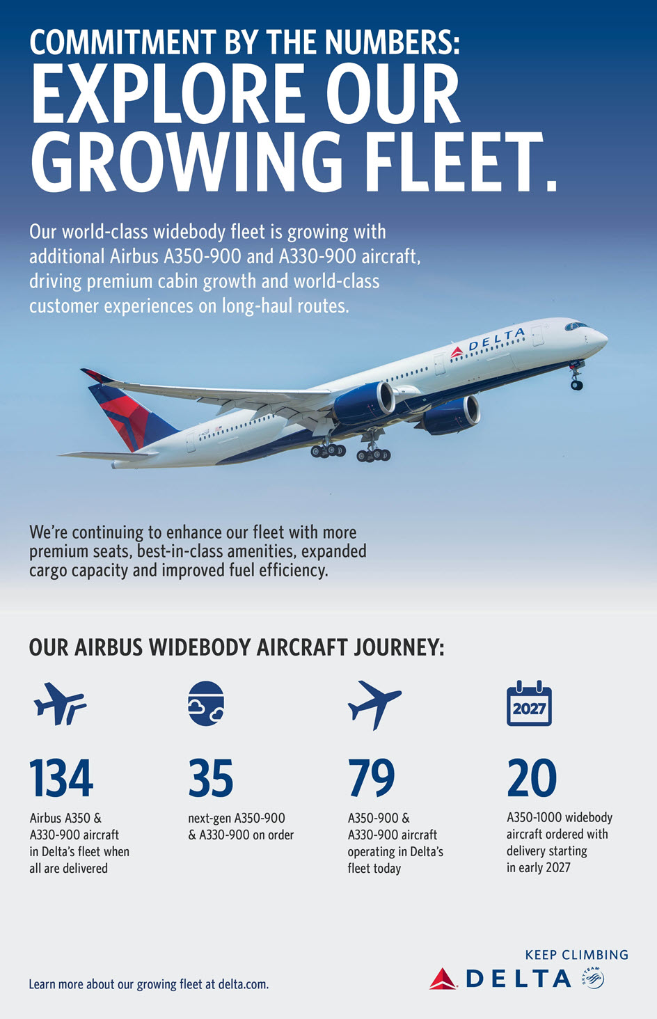 Delta’s fleet is undergoing significant renewal and expansion to match its international and premium growth strategy in the next decade and beyond. The new widebody entrants to the fleet will add more premium capacity to medium and long-haul international markets while improving fuel efficiency and margins.